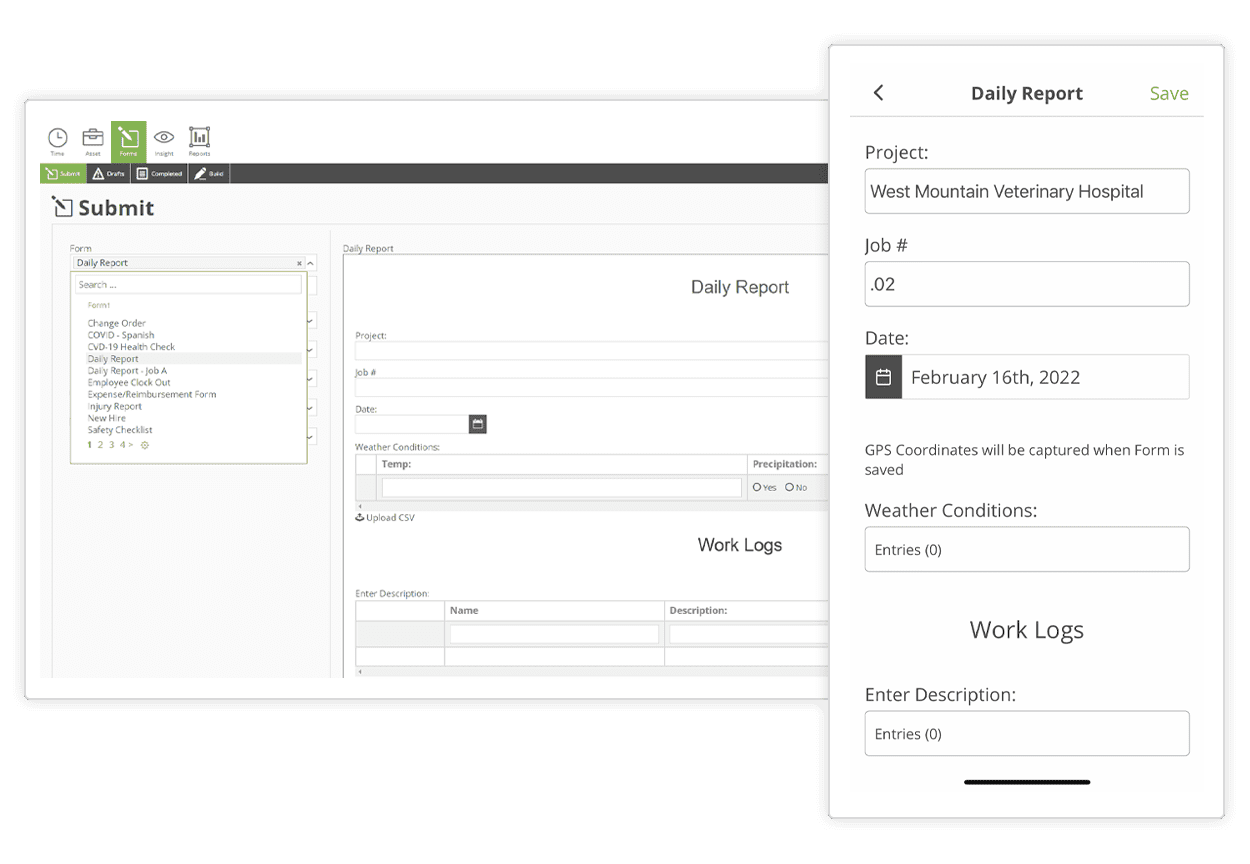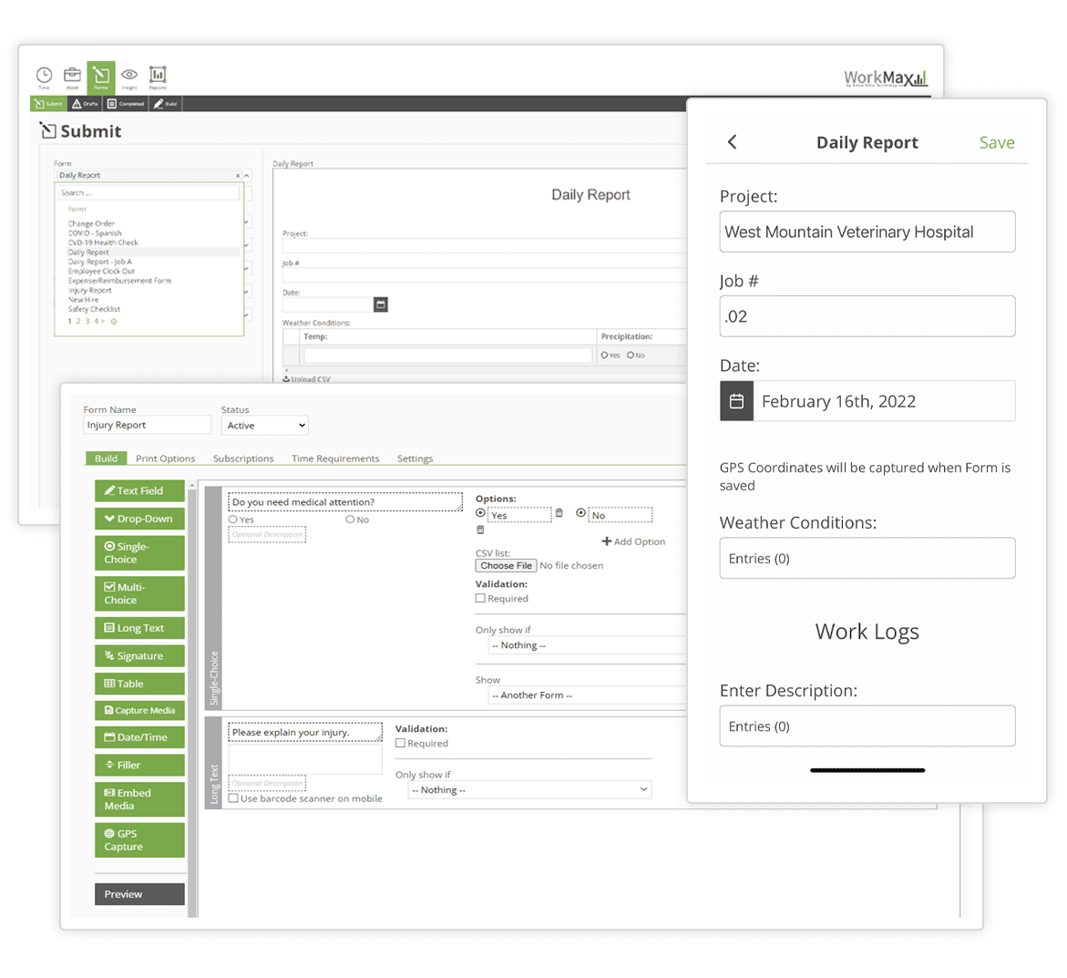 WorkMax FORMS is designed for maximum accessibility, allowing you and your construction team to access and complete forms from any device with a web browser, including mobile devices such as smartphones, tablets (Android and iOS), laptops and desktops.